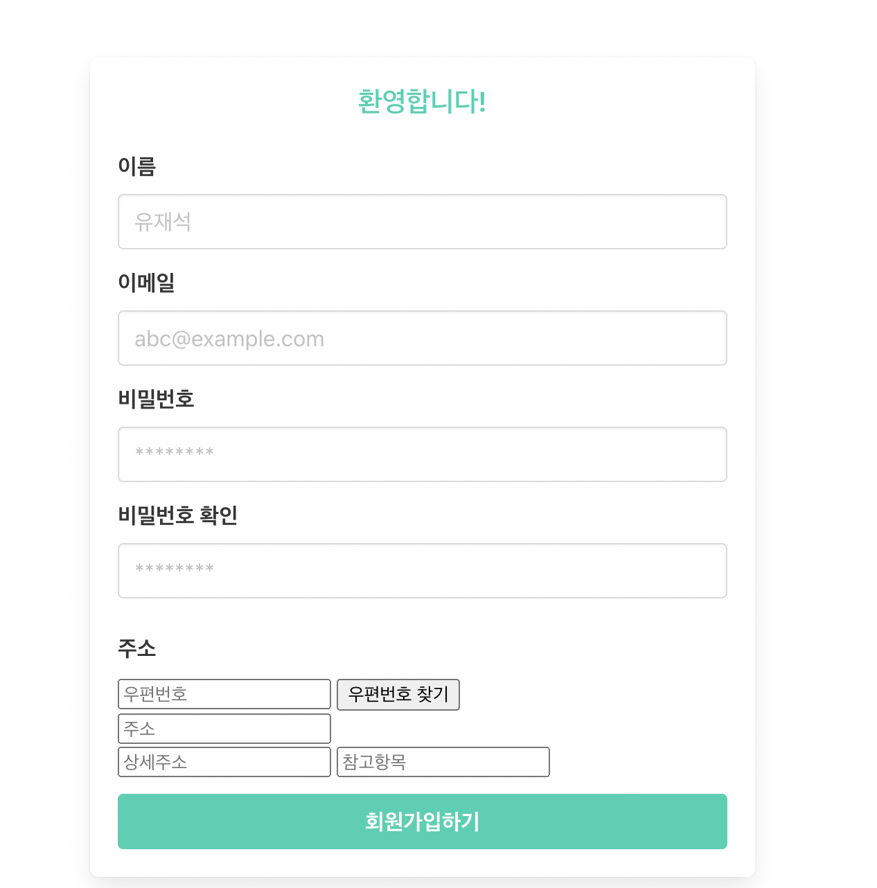 <div class="field"> <label class="label" for="addressInput">주소</label> <div class="control"> <input type="text" id="postcode" placeholder="우편번호"> <input type="button" onclick="execDaumPostcode()" value="우편번호 찾기"><br> <input type="text" id="address" placeholder="주소"><br> <input type="text" id="detailAddress" placeholder="상세주소"> <input type="text" id="extraAddress" placeholder="참고항목"> </div> </div>회원가입 페이지 html에서 값을 입력받을 칸을 만들어 주었고