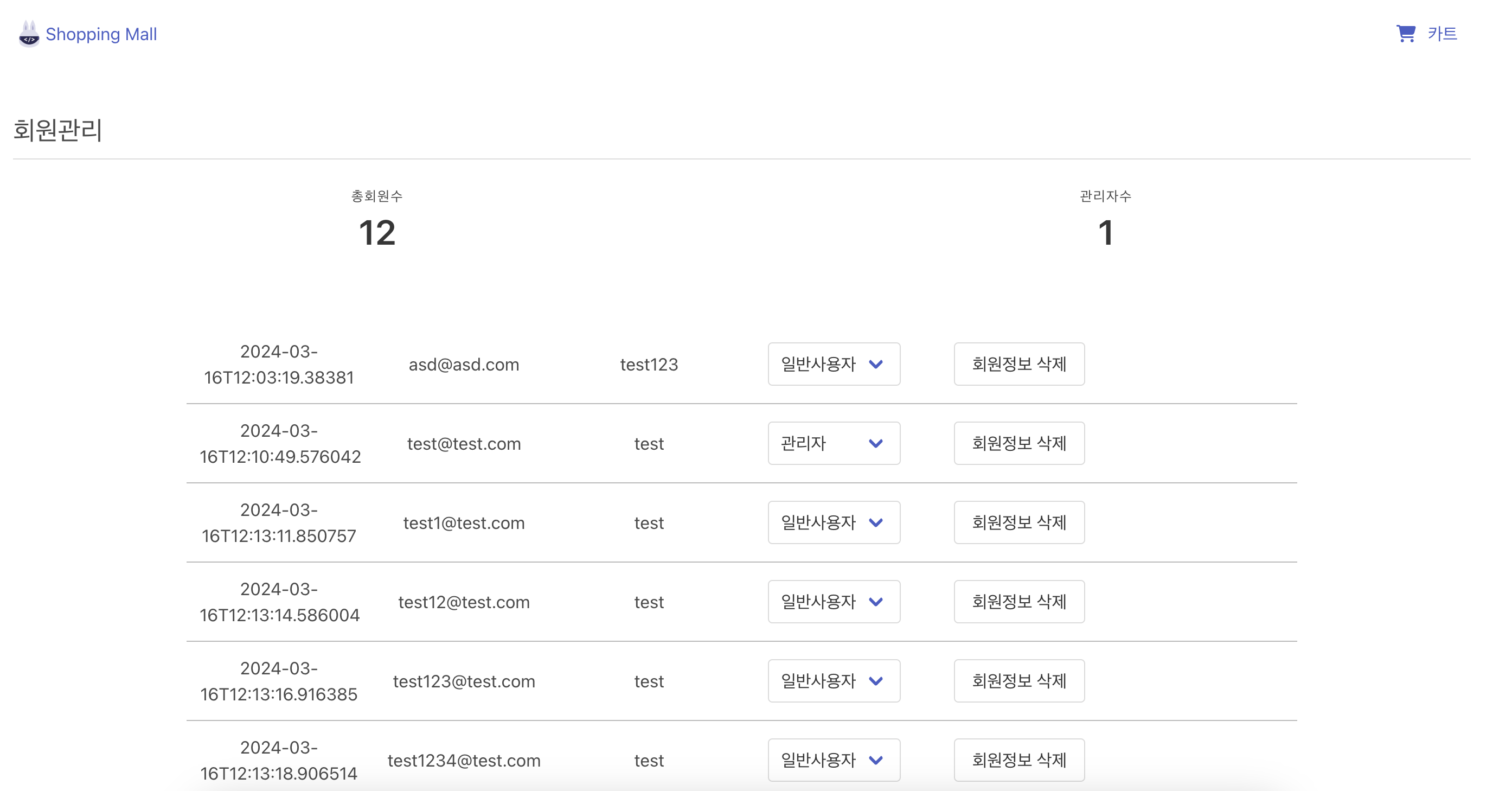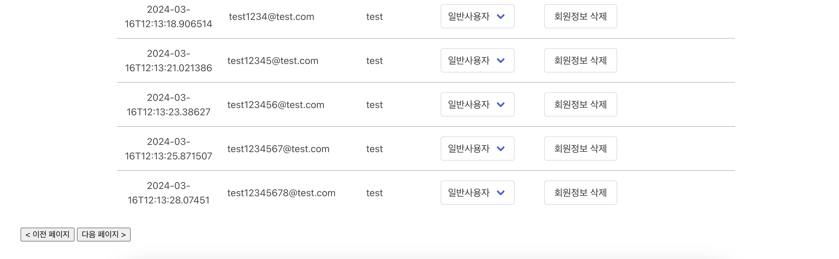 어드민으로 로그인 하면 어드민 페이지 버튼이 뜨고 회원 관리 창으로 갈 수 있다.
