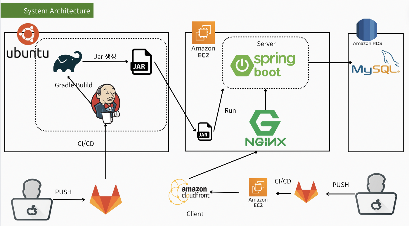 시스템의 구조는 젠킨스로 CI/CD를 해놔서 작업 내용을 푸시하면 젠킨스가 실행 중인 서버에서 파이프라인을 통해 jar파일을 빌드 후