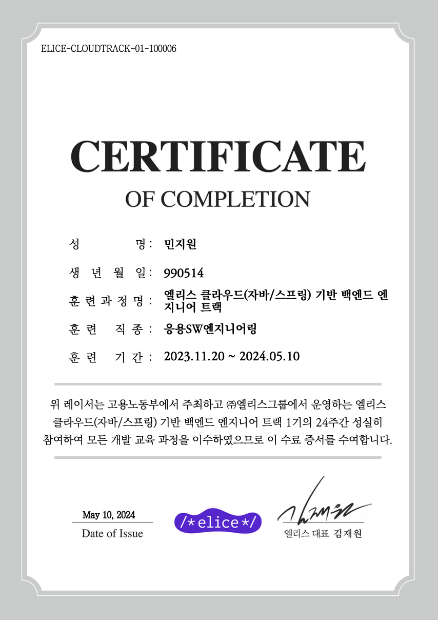 스프링에 대해 아무것도 모르던 내가 엘리스 트랙을 진행하면서 API를 개발할 수 있게 되고 프로젝트로 우수한 성적도 내게 되어 매우 보람찼고 같이 프로젝트를 진행한 조원들과도 친해져서 엘리스트랙을 하길 잘했다고 생각한 것 같다. 6개월 동안 매일 수업 듣고 프로젝트 하기 힘들어서 끝나고 나니 좋기도 하지만 이제 그냥 취업시장에 던져졌다는 느낌도 들어서 살짝 두렵기도 하지만 엘리스에서 운영하는 채용 사이트인 엘리스웍스도 있고 디스코드 채널에 채용 정보도 올려주시고 이력서 특강도 있으니 잘 활용해서 취업에 성공해야겠다!